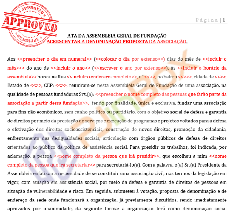 O Instrumento de Fundação de uma Entidade Beneficente de Assistência Social (com natureza jurídica de Associação) é composto por todos os documentos jurídicos necessários para a constituição e registro de uma organização que tenha como finalidade a promoção da assistência social especialmente para defesa e garantia de direitos.