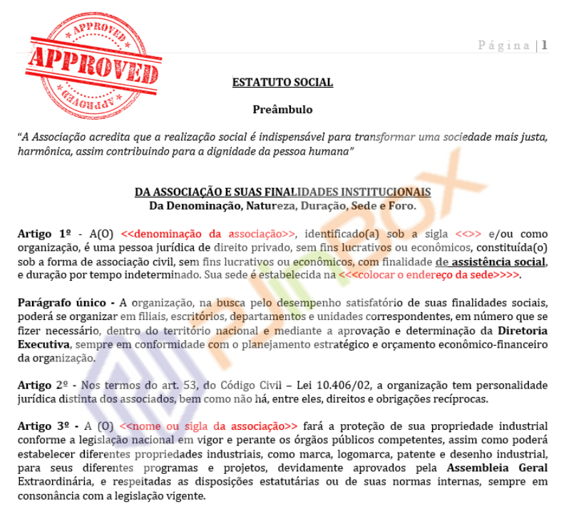 - 1 (um) modelo de Estatuto Social da organização, que representa a sua norma fundamental e onde estarão delimitadas as suas características como: denominação, sede, finalidades, órgãos que o administram como Diretoria Executiva com mandato por prazo determinado (sugerido 04 anos), órgãos de controle como Conselho Fiscal, responsabilidade dos associados, patrimônio social, além das disposições estatutárias obrigatórias para que a organização possa obter certificação de entidade beneficente de assistência social, garantindo os benefícios tributários como a imunidade tributária nos termos da lei.