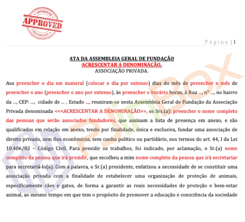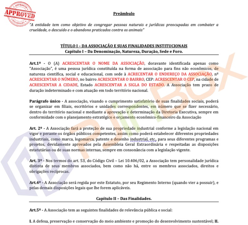 O Instrumento de Fundação de uma Associação de Proteção de Animais (Cães e Gatos) é composto por todos os documentos jurídicos necessários para a constituição e registro de uma organização da sociedade civil (OSC) que tenha como finalidade o resgate de cães e gatos abandonados e em situação precária, ou ainda, cães e gatos vítimas de maus tratos, além de proporcionar a esses animais acesso à médicos veterinários e tratamentos adequados, dar abrigo em locais seguros e saudáveis, mantendo-os em perfeitas condições físicos nos abrigos até que sejam adotados.