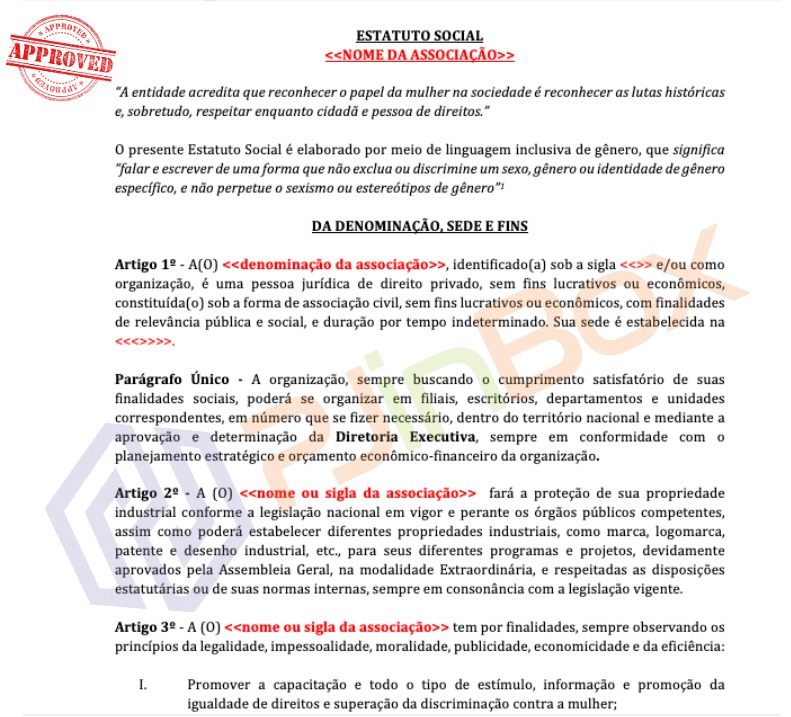 Aqui, o interessado encontrará: 1 (um) modelo de Ata de Fundação da Associação; 1 (um) modelo de Estatuto Social da Associação, que representa a sua norma fundamental e onde estarão delimitadas as suas características como: denominação, sede, finalidades, órgãos que o administram como Diretoria Executiva com mandato por prazo determinado (sugerido 04 anos), órgãos de controle como Conselho Fiscal, viabilidade de pessoa associada estrangeira residente no exterior participar de cargos de administração, política de conflito de interesses, limite de gastos da presidência sem aprovação da assembleia geral, compromisso de proteção no tratamento de dados pessoais, entre outras regras; 1 (um) modelo de Termo de Posse da Diretoria Executiva e Conselho Fiscal; 1 (um) modelo de Lista de Presença da Assembleia Geral de Constituição e 1 (um) modelo de Requerimento padrão de registro a ser apresentado perante o Cartório de Registro de Pessoas Jurídicas competente considerando-se o endereço da sede da associação. O Estatuto aqui disponibilizado foi elaborado utilizando-se de linguagem inclusiva, ou seja, escrito de uma forma que “não exclua ou discrimine um sexo, gênero ou identidade de gênero específico, e não perpetue o sexismo ou estereótipos de gênero”