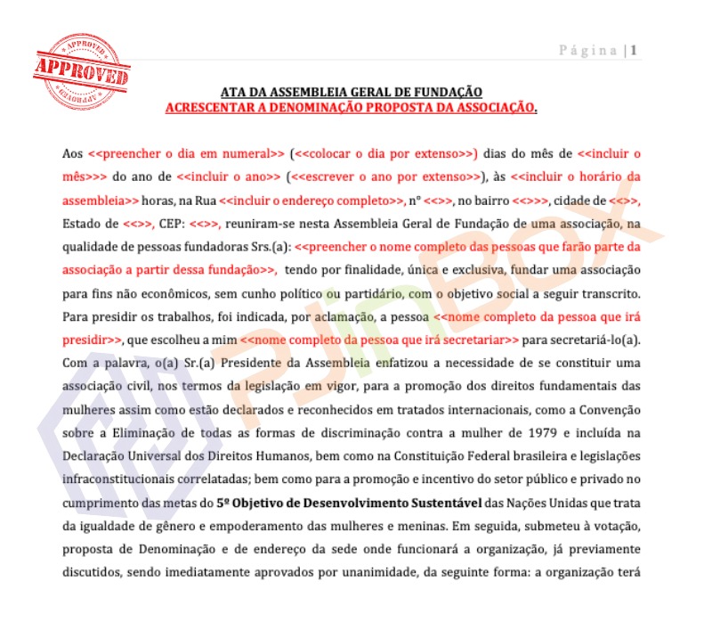 O Instrumento de Fundação de uma Associação de Proteção e Empoderamento da Mulher é composto por todos os documentos jurídicos necessários para a constituição e registro de uma organização da sociedade civil (OSC) que tenha como finalidade promover a defesa dos direitos fundamentais da mulher e o combate a discriminação na forma como estabelecido em tratados internacionais e legislação brasileira em vigor, bem como promover e incentivar o poder público e a iniciativa privada a cumprir as metas do 5º Objetivo de Desenvolvimento Sustentável das Nações Unidas e que trata da igualdade de gênero na vida pública, política, profissional e pessoal.