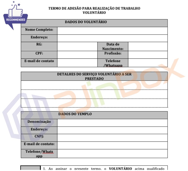 Além disso, incluímos 1 (um) modelo de Procuração Ad Negotia para representação do Templo nos órgãos públicos por outras pessoas que não apenas o representante legal, de forma a facilitar o seu dia-a-dia, 1 (um) modelo de Recibo de Doação e 1 (um) modelo de Termo de Adesão de Voluntário.