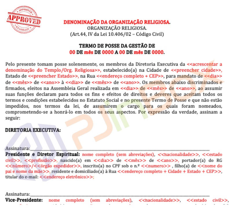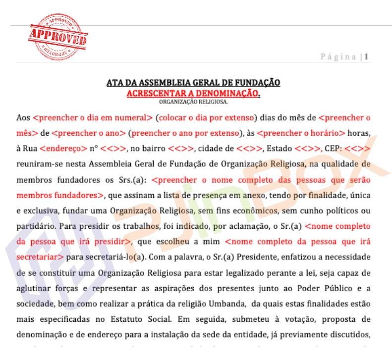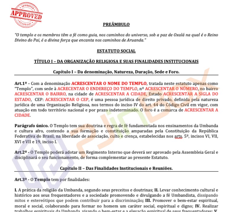 Aqui, o interessado encontrará: 1 (um) modelo de Ata de Fundação do Templo de Umbanda; 1 (um) modelo de Estatuto Social do Templo de Umbanda, que representa a norma fundamental do Templo e onde estarão delimitadas as suas características como: denominação, sede, finalidades, órgãos que o administram como Diretoria Executiva com mandato por prazo determinado (sugerido 04 anos), órgãos de controle como Conselho Fiscal, responsabilidade dos membros, patrimônio social, entre outras; 1 (um) modelo de Termo de Posse da Diretoria Executiva com prazo determinado (sugerido 04 anos) e Conselho Fiscal; 1 (um) modelo de Lista de Presença da Assembleia Geral de Constituição e 1 (um) modelo de Requerimento padrão de registro a ser apresentado perante o Cartório de Registro de Pessoas Jurídicas competente considerando-se o endereço da sede do Templo.